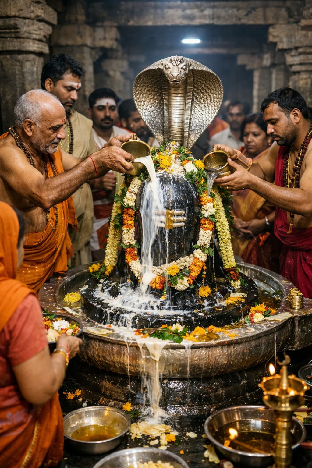 Ancient ritual of anointing Shiva Lingam for health, wealth, and spiritual growth.